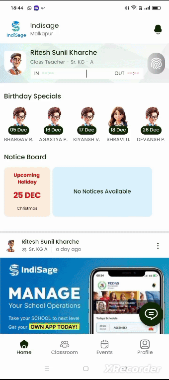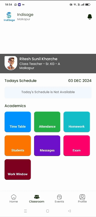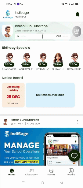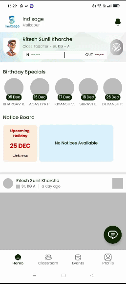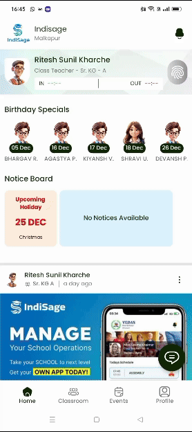 Enable seamless teacher attendance tracking directly from the home screen. With the “Mark In” and “Mark Out” options, teachers can record their arrival and departure times effortlessly. This feature ensures accurate attendance logging, supports efficient record-keeping, and promotes accountability, all while simplifying the daily workflow for educators.